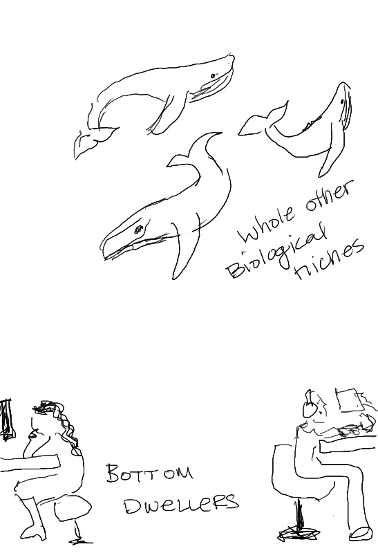 I used to work in an office space with a super high ceiling, and I had this image of the ocean and the different biological niches. You know, the sunlight zone, the twilight zone… we were the bottom dwellers in this tall tall space and there could be different biological niches above us and we’d just be oblivious to it.